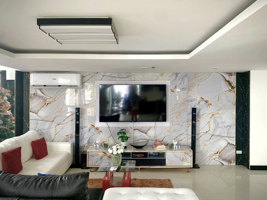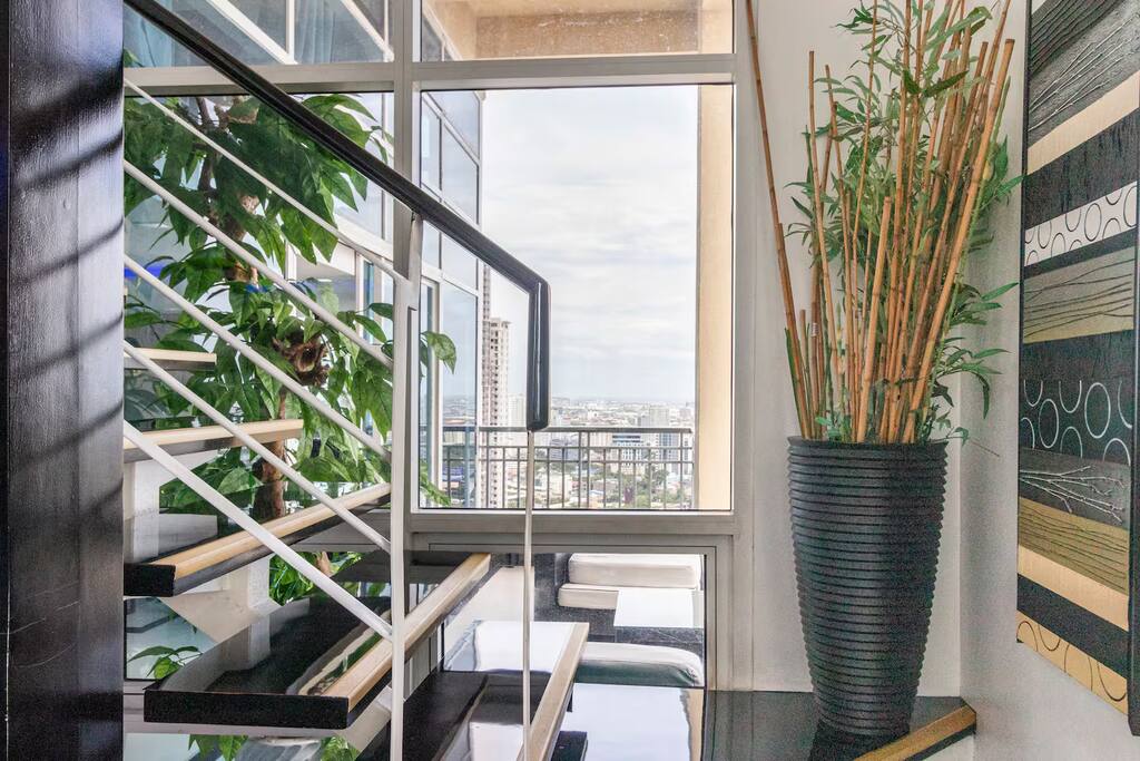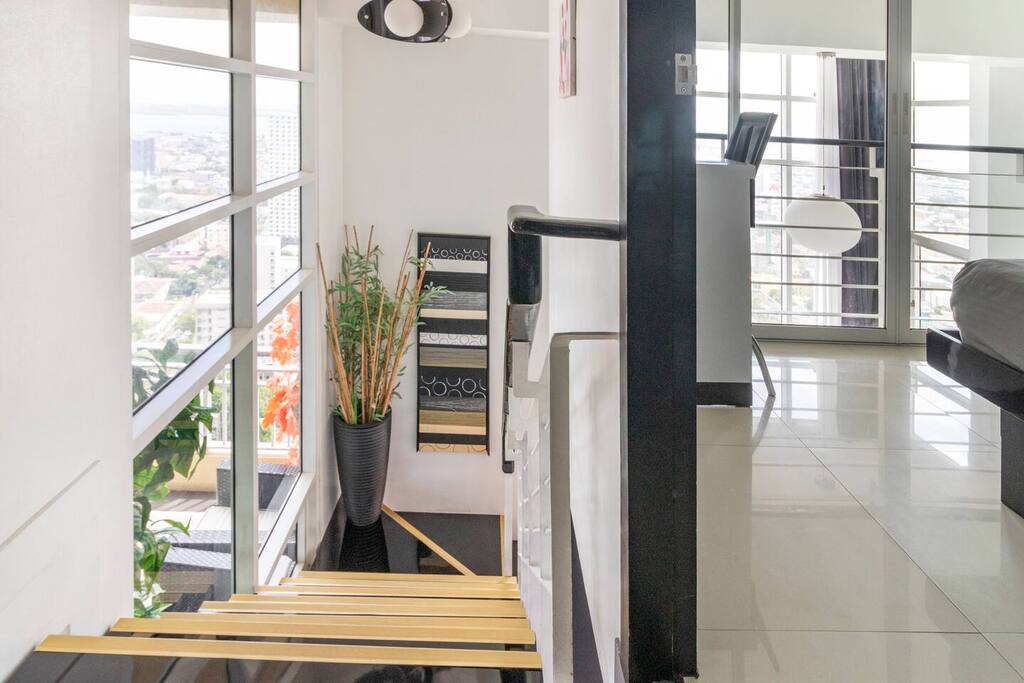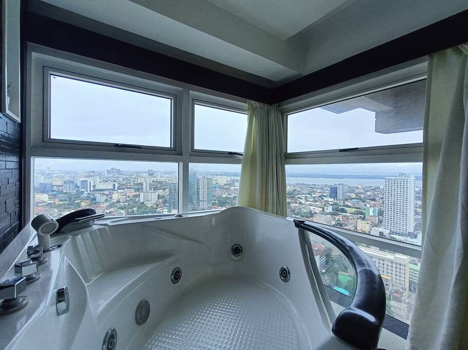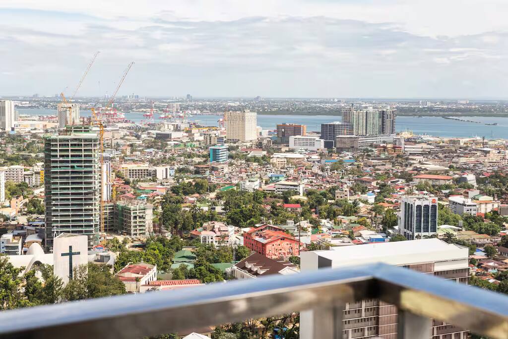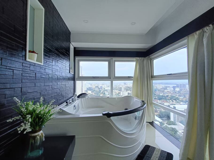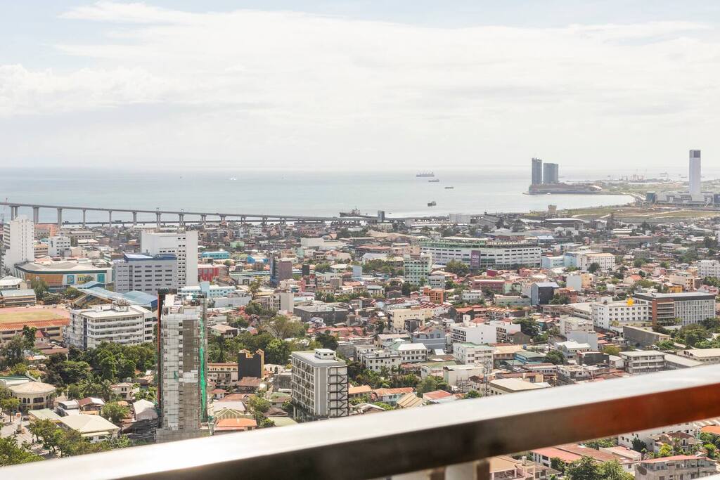 First floor ------------- * Panorama view! * Large corner balcony with sofa group. * Living room, tiled, with designer sofa group consisting of 3 sofas. Wifi. UHD 4k smart TV with Netflix Premium. Aircon. * Kitchen area with ceramic stove, electrical oven, microwave oven, side-by-side refrigerator/freezer, stove fan and essential utensils. * Dining area with dining table with 6 chairs. Hot and cold drinking water dispenser * Small chess style dining group with 4 chairs with view towards the sea. * Bathroom, tiled. Sink, water closet. Cold water. Fan. Second floor ---------------- * Master bedroom with queen size spring bed. Windows with wonderful view of Cebu city, Mactan and the sea. Jacuzzi. Aircon. Ensuite bathroom with sink, toilet, shower room. Fan. * Second bedroom with spring double bed. Nice view towards the sea. Aircon. Ensuite bathroom with sink, toilet, shower room. Fan. * Third bedroom with spring double bed. Aircon. Ensuite bathroom with sink, toilet, shower room. Fan. The unit is good for up to 23 guests, additional guest fee PHP500/guest and night from guest 7 and up. You can book for up to 16 guests in the app. If you want to be more than 16 guests, please request and pay during the booking. Total condo area: 139 sqm Important Notice: Please be informed that the building undergoes scheduled power interruptions between 2:00–4:00 AM in September due to ongoing maintenance. To ensure your comfort, we provide emergency lights, rechargeable fans, and power stations that can operate for up to 3–4 hours enough to keep your essentials running and help you rest easy during the short interruption.